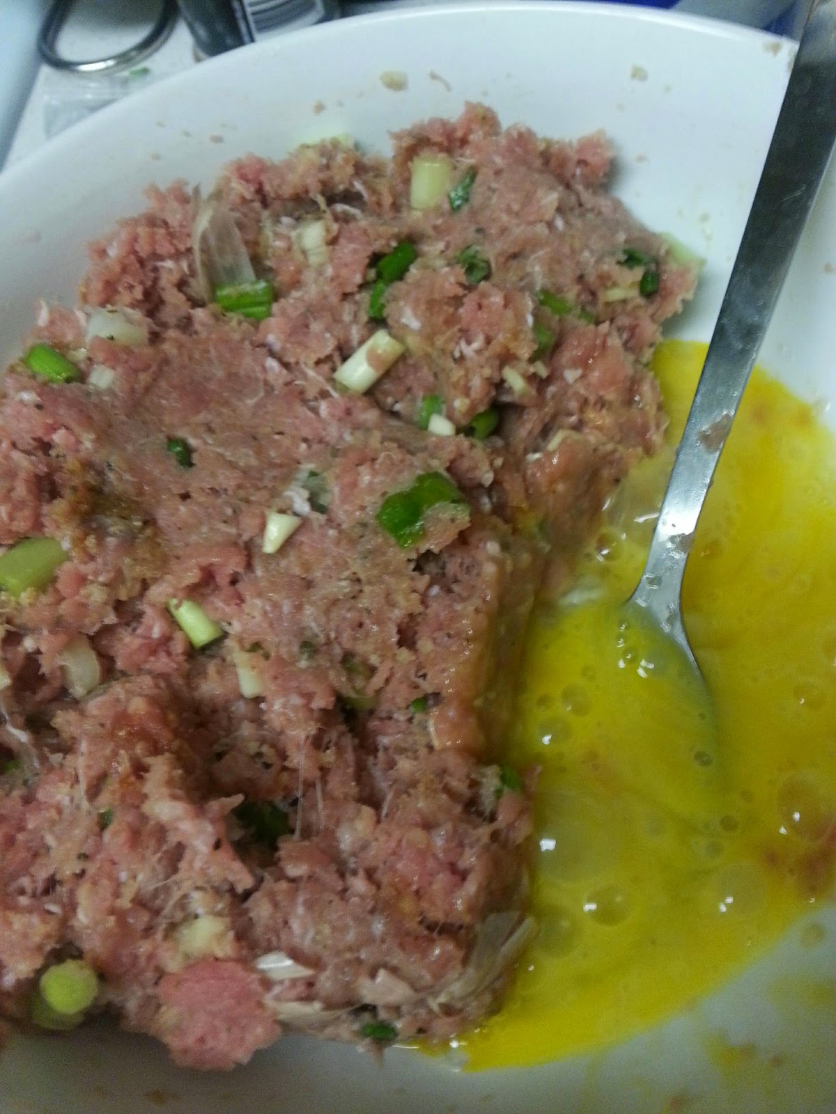 Dice tomato, onion, green onion or chives, mince garlic and ginger very thinly. Mix ground turkey and diced ingredients, add salt, freshly ground colorful pepper, black pepper, garlic powder, dried basil, italian falvored bread crumbs or use any, parmesan cheese, cage-free organic eggs, patis, soy sauce, olive and sesame oil. Mix very well.